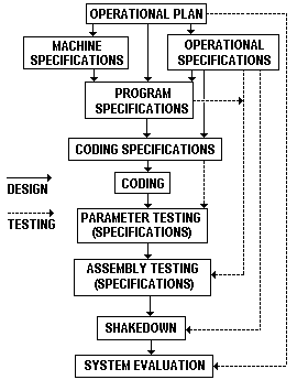 After coding, each component subprogram is parameter tested on the machine by itself. This testing phase uses an environment that simulates pertinent portions of the system program. Each test performed during this phase is documented in a set of test specifications that detail the environment used and the outputs obtained. In the figure, the dashed line indicates that parameter testing is guided by the coding specifications instead of by the coded program; in other words, a programmer must prove that he satisfied his specifications, not that his program will perform as coded. (Actually, test specifications for one subprogram can be prepared in parallel with the coding).
