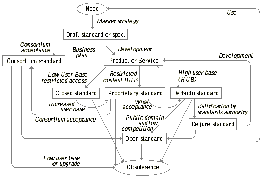 The figure underneath shows how the standardisation process can allow different routes between need and obsolescence. The different types of standards as outlined by /Moreton, 1995/ are included in the diagram and the different routes and conditions (shown in italic) that lead to the formation of a standard are shown along the transitions from one standard or state to another. The different types of standard generally start their development in similar ways but after formulation and specification the paths diverge depending on a number of factors such as: whether the standard is published, whether there is a significant user base for it and other non-technical factors such as its promotion on an international standards committee. The other major affect on the development of standards is the technology lifecycle which interacts with the standards process throughout the lifecycle of the standard. Indeed, the two cyclic processes are intertwined to the extend that as an standardised technological development reaches a high user base it could trigger the definition of the standard into the de facto are. Similarly, the decline of a technology at the end of its useful life will trigger other developments and push the standards towards obsolescence.