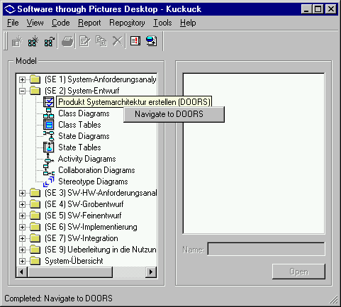 ContentDie Firma Aonix bietet ein Werkzeug, das darauf ausgelegt ist, das Arbeiten mit UML nach dem V-Modell zu unterstützen. Anbei eine Kurzbeschreibung dieses Werkzeugs. Bei Interesse kann ich gerne weitere Auskunft geben. Mit freundlichen Grüßen Klaus Wachsmuth +--------------------------------------------------------------------- Aonix GmbH, Durlacher Allee 95, D-76137 Karlsruhe Phone: (+49) 721 98653-0, Fax: (+49) 721 98653-98 Email: Wachsmuth@aonix.de +--------------------------------------------------------------------- > -----Ursprüngliche Nachricht----- > Von: vm-d-l [mailto:uth@SWE.GPPM.DE] > Gesendet am: Freitag, 12. Mai 2000 10:37 > An: Multiple recipients of V-Modell-Mailingliste > Betreff: Case Tools fuer V-Modell und UML (476) > > Hallo, > wir suchen Informationen und Erfahrungen für den Einsatz von > Case Tools > für die objektorientierte Sytementwicklung nach V-Modell und UML. > Kann uns jemand eine Empfehlung geben, welche der aktuellen Case Tools > geeignet sind und die Anforderung V-Modell und UML abdecken? > > > Vielen Dank und viele Grüße > > Thomas Blum > GIP Aktiengesellschaft > Göttelmannstr. 17 > 55130 Mainz > Tel.: +49.6131.80124.65 > Fax: +49.6131.80124.24 > Email: thomas.blum@gip.com